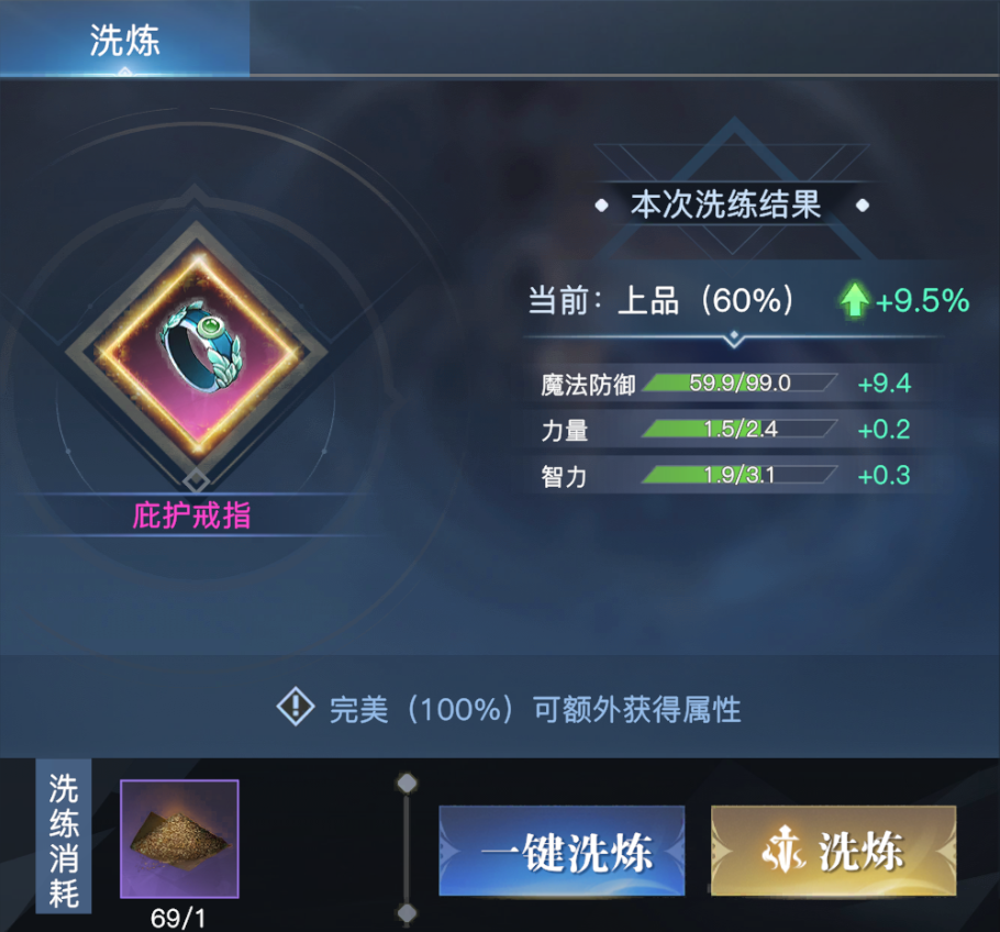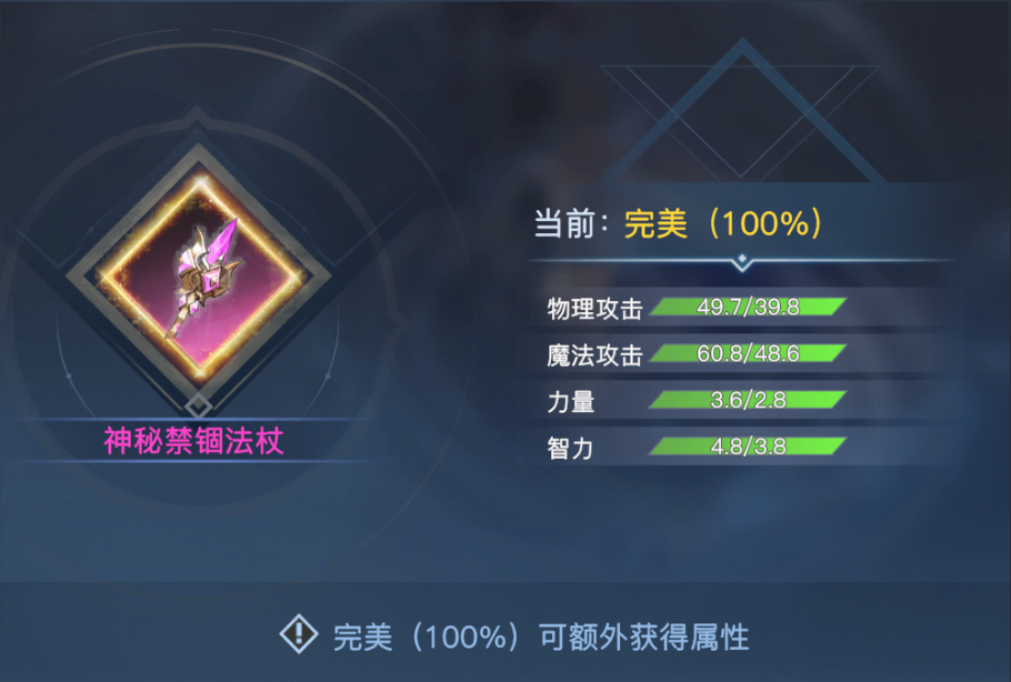 这时候,可能就会有细心的小伙伴很好奇——那么洗练界面中装备底端提示的“完美(100%)可额外获得属性”是怎么回事呢?