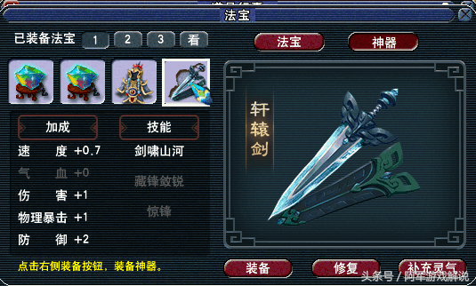 点击法宝旁边的神器,将神器装备上就可以获得神器属性或者