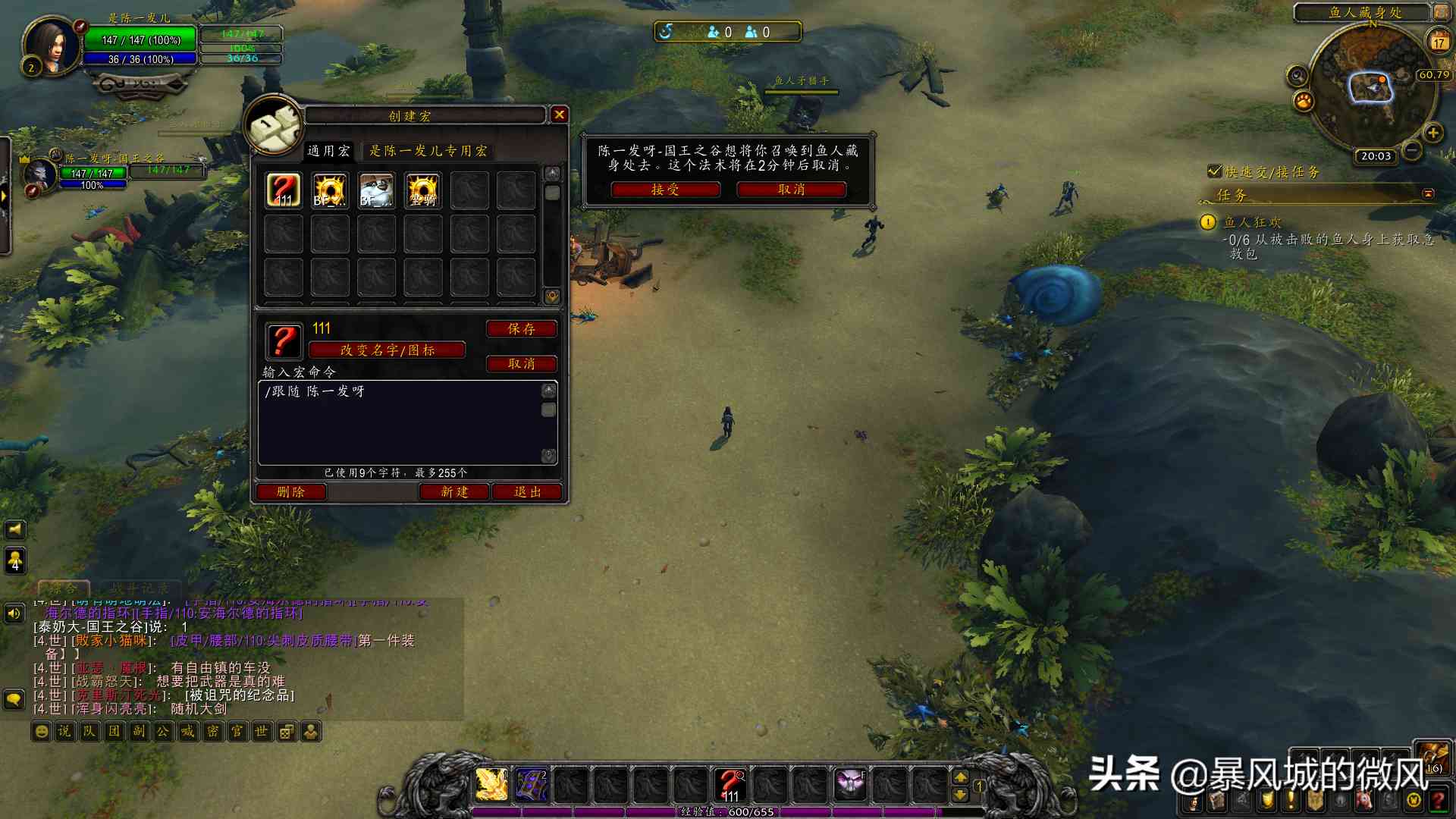 经验BUFF号因为封顶20级,所以推荐选一个能T的职业,比如防骑,20级防骑拉5-6个怪A一圈下来基本无伤,无敌都不用开,而且速度非常快,实测5个怪,26秒就能A完。20级封顶这个号推荐把装备穿全了,每个装备栏都装备上,因为等级越低,伤害越高!等大号30级之后,做任务时就大号跟随小号,让20级小号去杀怪,比大号打得快,还无伤,不用喝水休息。