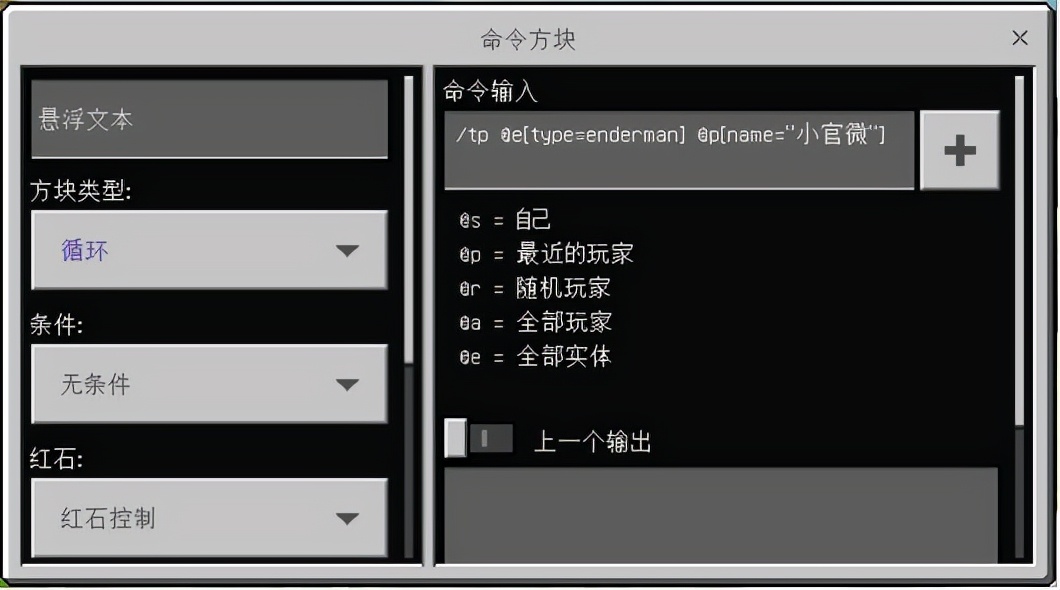 在1号命令方块中,输入指令/tp @e[type=enderman] @p[name="方块菌"],方块类型设置为循环,条件为无条件,红石设为红石控制。