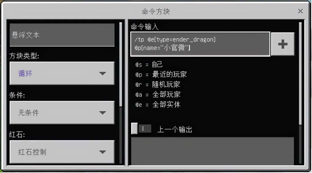 然后将1号命令方块中的指令修改为/tp @e[type=ender_dragon] @p[name="方块菌"],其他条件保持不变。