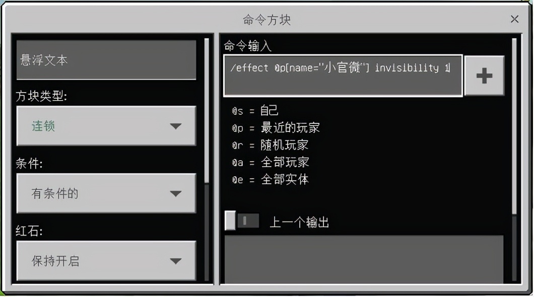 接着,在2号命令方块中输入/effect @p[name="方块菌"] invisibility 1,方块类型设置为连锁,条件为有条件的,红石设为保持开启。