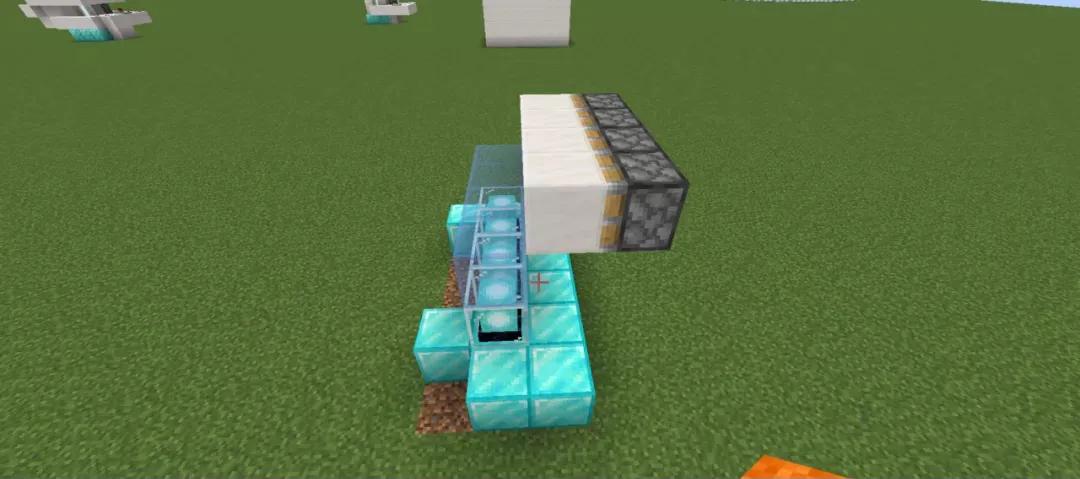 接来下就是放上粘性活塞,粘性活塞的前面要放一个方块。粘性活塞和方块的位置就参考上图。因为信标的激光比较挡视线,阿鸡就暂时把激活它的方块给打掉,但是你们在制作的时候就没有必要了。