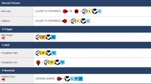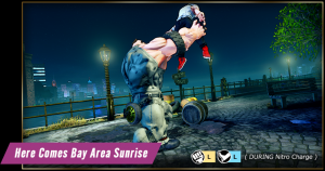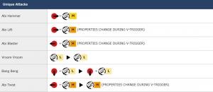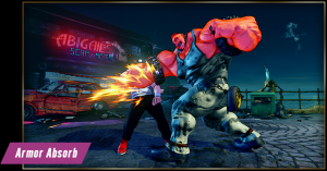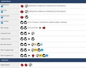 以下为阿比盖尔出招表,其中有两个指令投招式,但事实上,他的核心技能是狂战士冲刺(Nitro Charge Run,同时按两个脚)。这个必杀技有一发刚体,EX版有两发,以及多种派生。可以打、指令投、中段、VS,利用这招能打出有趣的择。