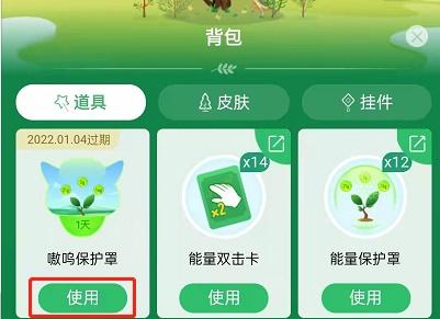 4、最后返回蚂蚁森林,点开背包,找到嗷呜保护罩,点击使用即可。