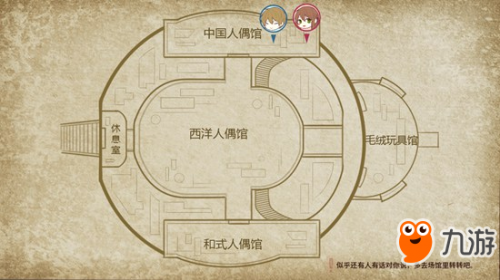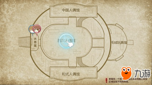 醒来之后,我们将开始进入人偶馆进行探索,点击左下角的地图,我们可以看到人偶馆分为西洋人偶馆、中国人偶馆、和式人偶馆、毛绒玩具馆四个场馆,点击其中一个即可前往,另外在地图右下角也有感叹号提醒我们接下来的主要事件。