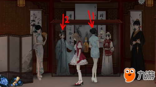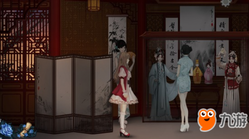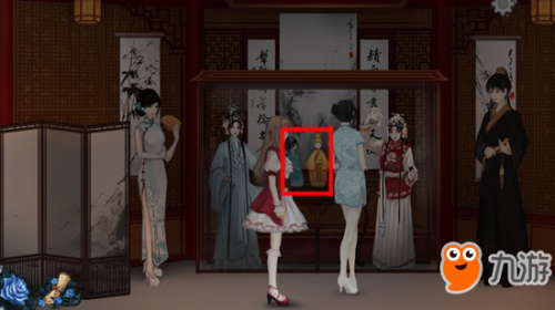 6、先点击旗袍女子,和她进行对话,再点击左侧真人大小的人偶,触发对话“旦角”。