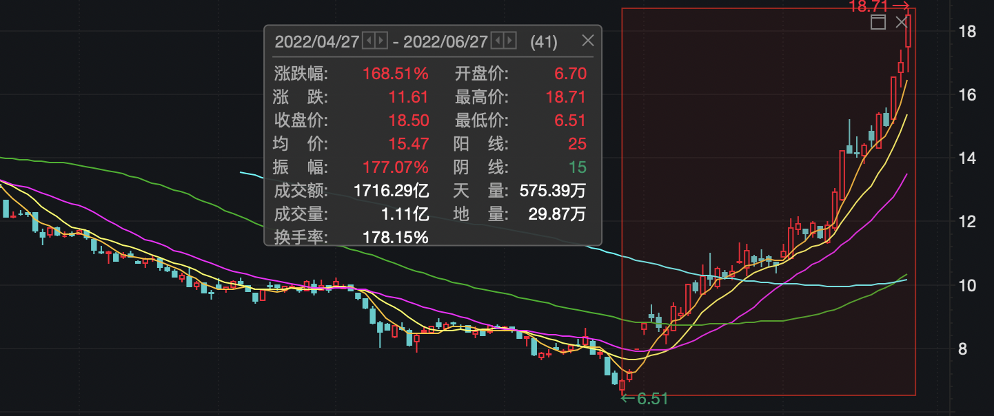 6月27日收盘,长安汽车涨8.76%,报18.5元/股,总市值1836亿,创历史新高。两个月内,长安汽车股价区间涨幅已超168%。