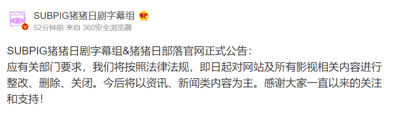 随着时代的变化,各种动漫组也是日渐宣布解散关闭的,最近又有个新消息,猪猪字幕组宣布解散了,又一个时代结束了,当初陪伴着我长大的那些个字幕组好像基本上都消失了。