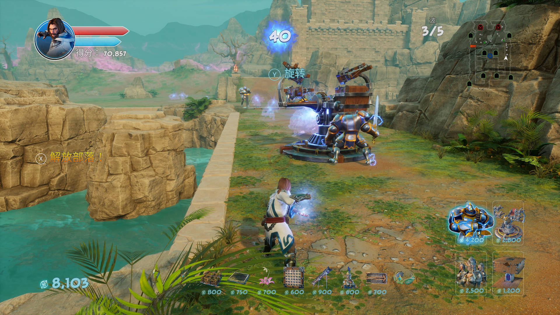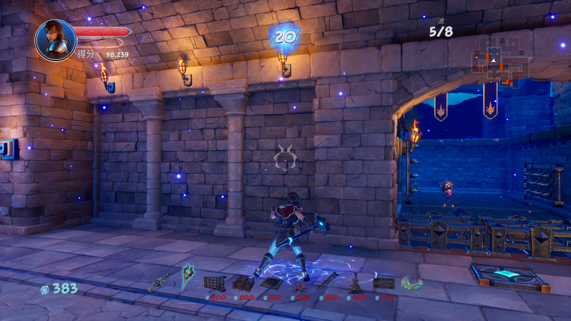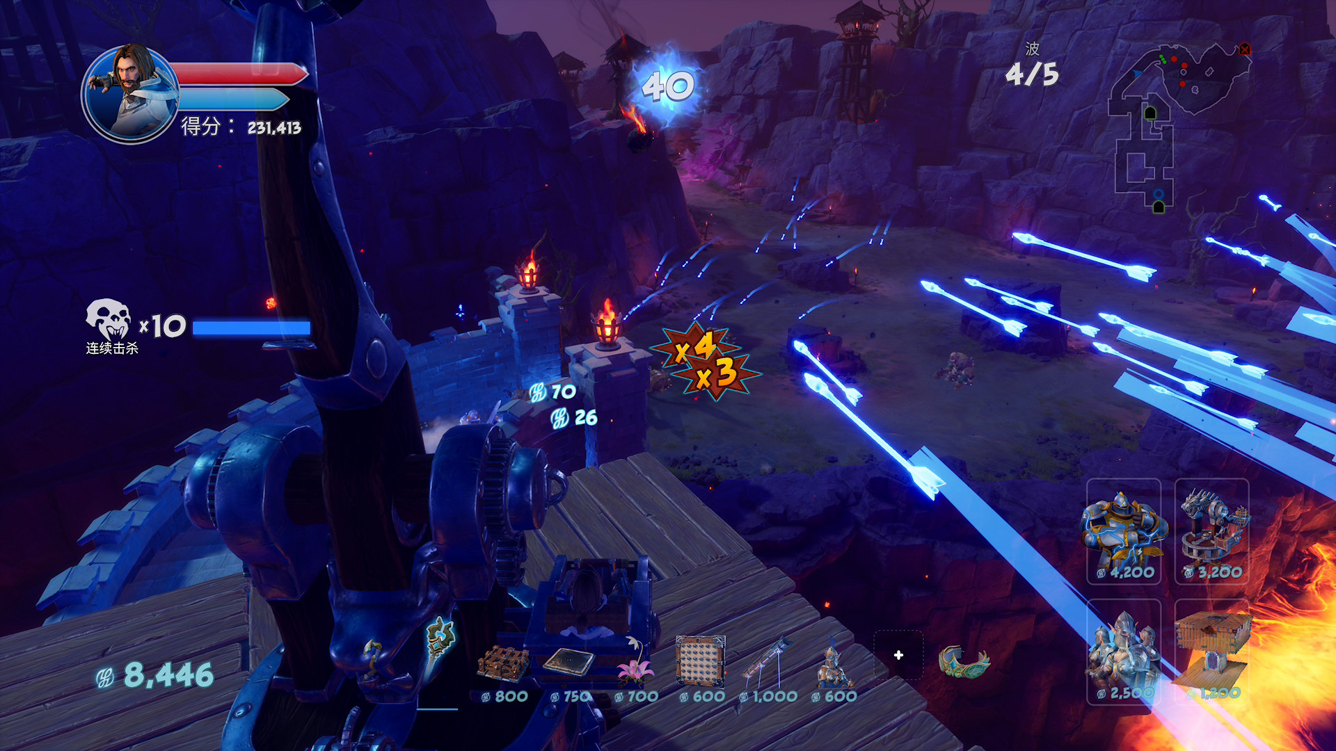 上面提到的几点看起来都很不错,然而经过几次试错就会发现,自己依然可以在场景中的建筑过道内掏出“屋顶激光”、“焦油陷阱”和“锯刃发射器”老三样进行防守。或者摆出一排骑士,配合弓箭手方阵使用自己的投石机、连发弩炮等设备进行轮番轰炸,尤其后一种玩法让流程更像是走个过场,即便最后一波会添加敌方Boss,处理方法也基本相同,从而让这类关卡变成了整个战役中最简单的几个。如此体验下来,好处是刷骷髅会比较无脑,但面无表情的盯着左侧几乎不会断掉的连杀图示也是现实。