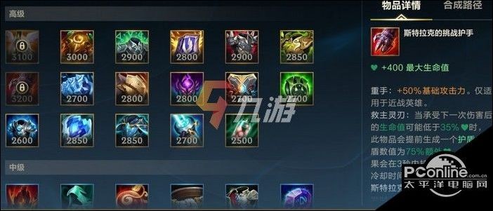 第二件出 斯特拉克的挑战护手 ,能给剑魔提供非常可观的血量以及与血量挂钩的攻击力。在残血时获得生命护盾,体型变大,韧性提高,非常契合剑魔这种有很高操作上限越是残血越能发挥出强悍实力反打的英雄。