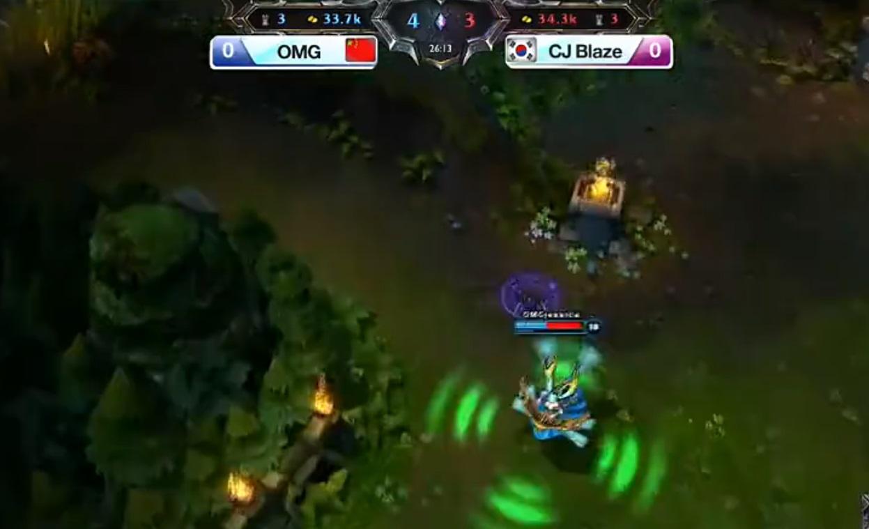 简单说一下OMG与CJB的比赛内容,首局比赛OMG选出鳄鱼、稻草人、发条、EZ与琴女的组合,被CJB初期换线,没打到对线,OMG通过抓机会拿到一血,进入中期之后,CJB马上开始展开了最韩式的一套打法。