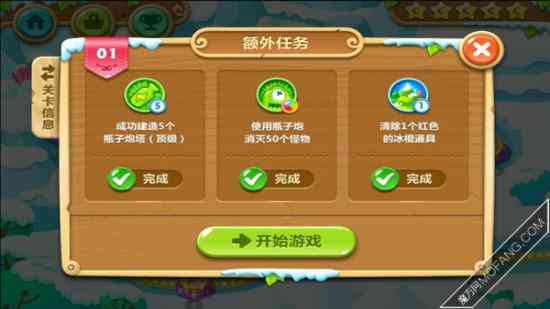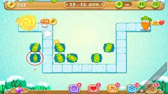 在15波怪物袭击中保卫萝卜不受攻击,也就是获得金萝卜。这是额外任务,要注意哦先连续建造二个瓶子炮塔升一级(视能力升级),清除道具瓶子炮塔升级(满级)瓶子炮塔升级(满级),继续清