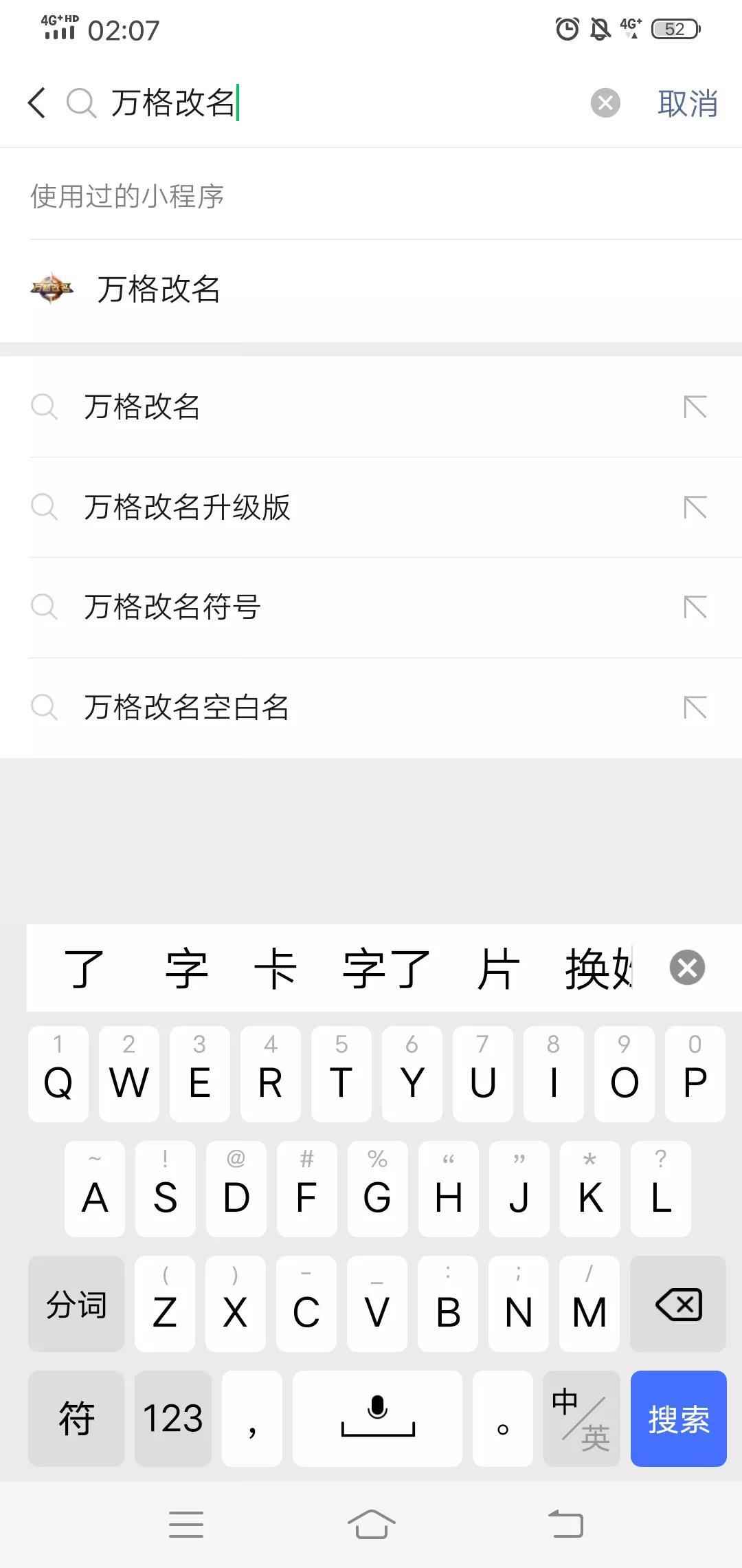 第一步,打开你的微信,小程序搜索万格改名就好啦。哈哈哈哈是不是很容易,进去万格改名以后输入你想要的名字然后生成,再复制,然后就好啦,进去游戏改名粘贴就好了,快点去生成你喜欢的名字吧!