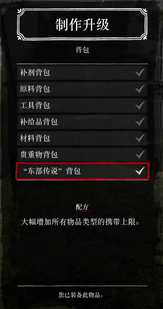 《荒野大镖客2》当中玩家可以把素材让进自己的背包当中进行携带,不过很多时候玩家玩玩都会觉得自己的背包容量不是特别的大,装的东西比较少,那么有没有什么方法能够提高自身携带的物品数量呢?答案肯定是有的,那就是制作东部传说这个背包。