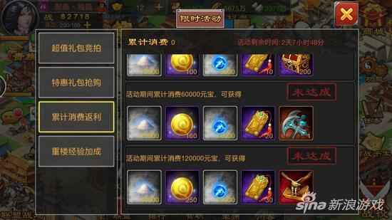 不说我了,再说下去你们就看不到字幕我了,我们还是来说说七雄争霸手游活动系统吧。活动系统目前只有4活动,它们分别是要钱的、要钱的、要钱的和不要钱的活动。咳咳,错了错了。是超值礼包竞拍活动、特惠礼包抢购活动、累计消费返利活动和重楼经验加成活动。不过字幕我有一点没说错,前面三个活动都是需要元宝参加的。像我等穷孩子只能参加重楼活动了。