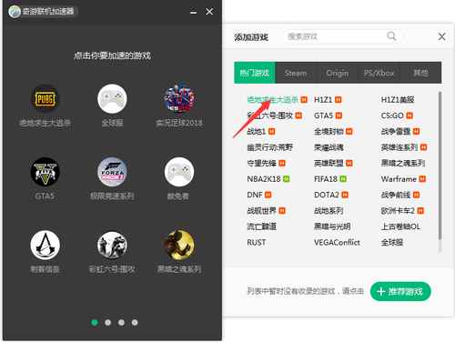 四.在游戏列表内添加游戏:找到要玩的绝地求生大逃杀游戏,点击添加游戏。