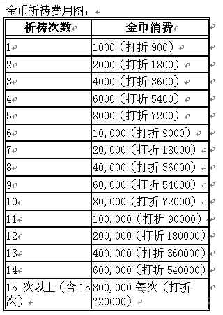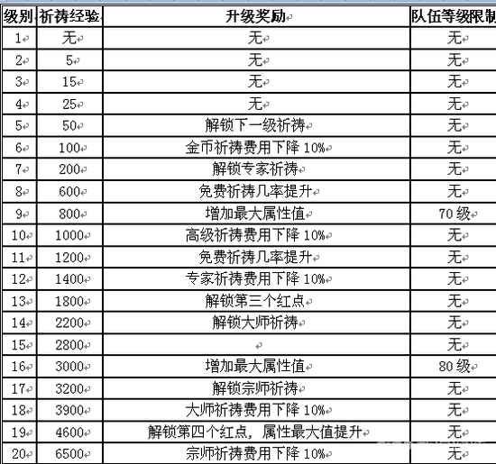 其次,祈祷分为金币祈祷和钻石祈祷,金币祈祷每祈祷一次(无论成功还是失败)都+1点经验, 高级祈祷 (消耗50钻) +5点经验。 专家祈祷 (消耗100钻) +10点经验,大师祈祷 (消耗200钻) +20点经验,宗师祈祷 (消耗400钻) +40点经验。下面是祈祷升级经验图: