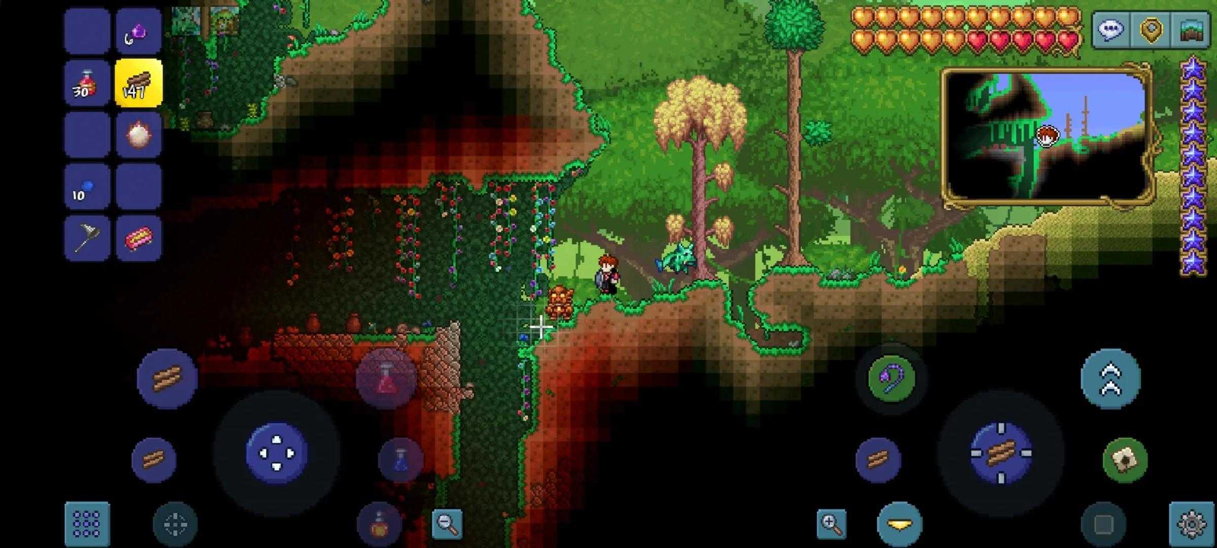 小世界,猩红这张地图除了有金字塔,往后面还有附魔剑,位置非常好找,后面巨树顶端还有一个天空神殿,连梯子都不用搭,可以直接上去。一开始往左走,穿过沙漠到第一个洞口,进去,往下走,当心