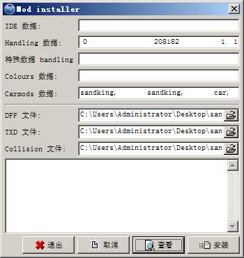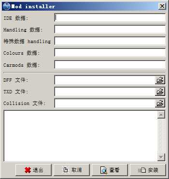 回到GGMM软件。单击选项,里面有个手动安装mod,找单击后就出现下图界面,分别导入之前下载的dff文件、txd文件和col文件,有就导入,没有就算了。