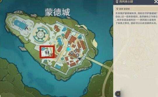 首先凯亚就位于【蒙德城】的【西风骑士团】内,就是那个盾牌加上一个剑的图标,具体位置如上图标注区域所示。我们可以通过蒙德城附近的【传送锚点】,来到蒙德城对着小地图走过去。
