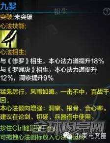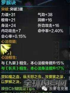 罗睺诀:此心法主要增加气劲、力道,和九婴相生,根骨提升15%,与长天心法相生,身法提升17%,心法技能焚血:增加内功攻击力,每秒损失50生命,持续20秒。再次使用技能可以提前结束焚血效果,耗血加攻虽然用处不大,但是配上神威的背水绝对没的说。