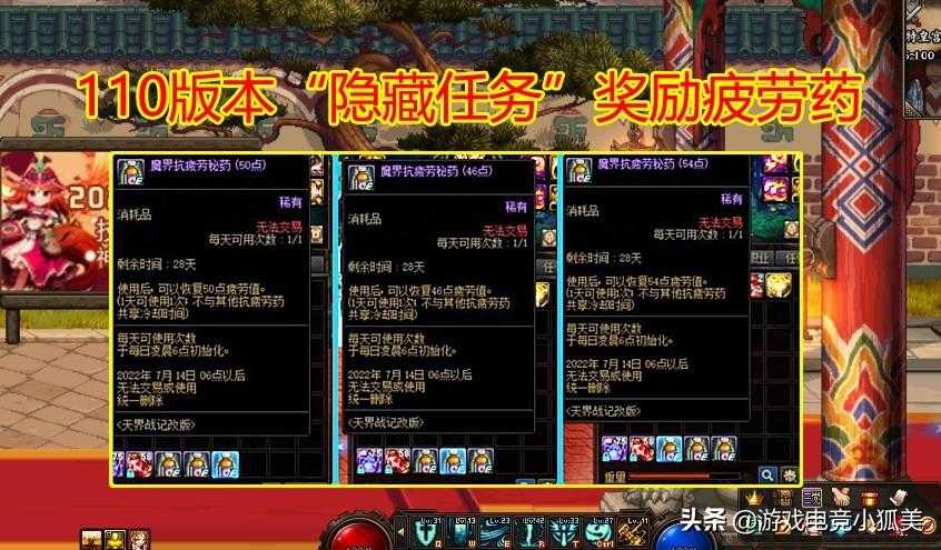 110版本升级是前期最主要的任务,不过大部分玩家想要快速满级,就不得不氪金疲劳药,尤其是多号党玩家,更是缺少这些道具,那么110版本还是有一个隐藏任务,可以获取疲劳药的,当然如果不