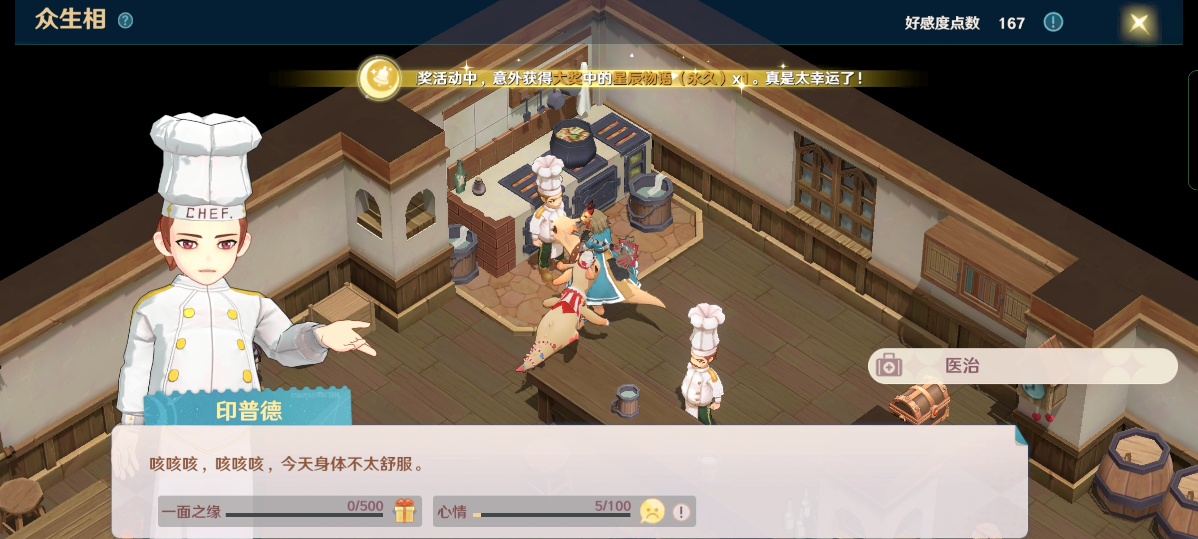 在与NPC套磁的过程中,大家会注意到NPC当时的状态与心情,这些状态对好感度的提升都有着很重要的影响,比如有些NPC处在生病的状态,心情十分不美丽,此时直接送礼,效果就会大打折扣,有些NPC甚至根本就不提供给你套近乎的方式,必须要在治疗完成后才能顺利开展攻略大计。