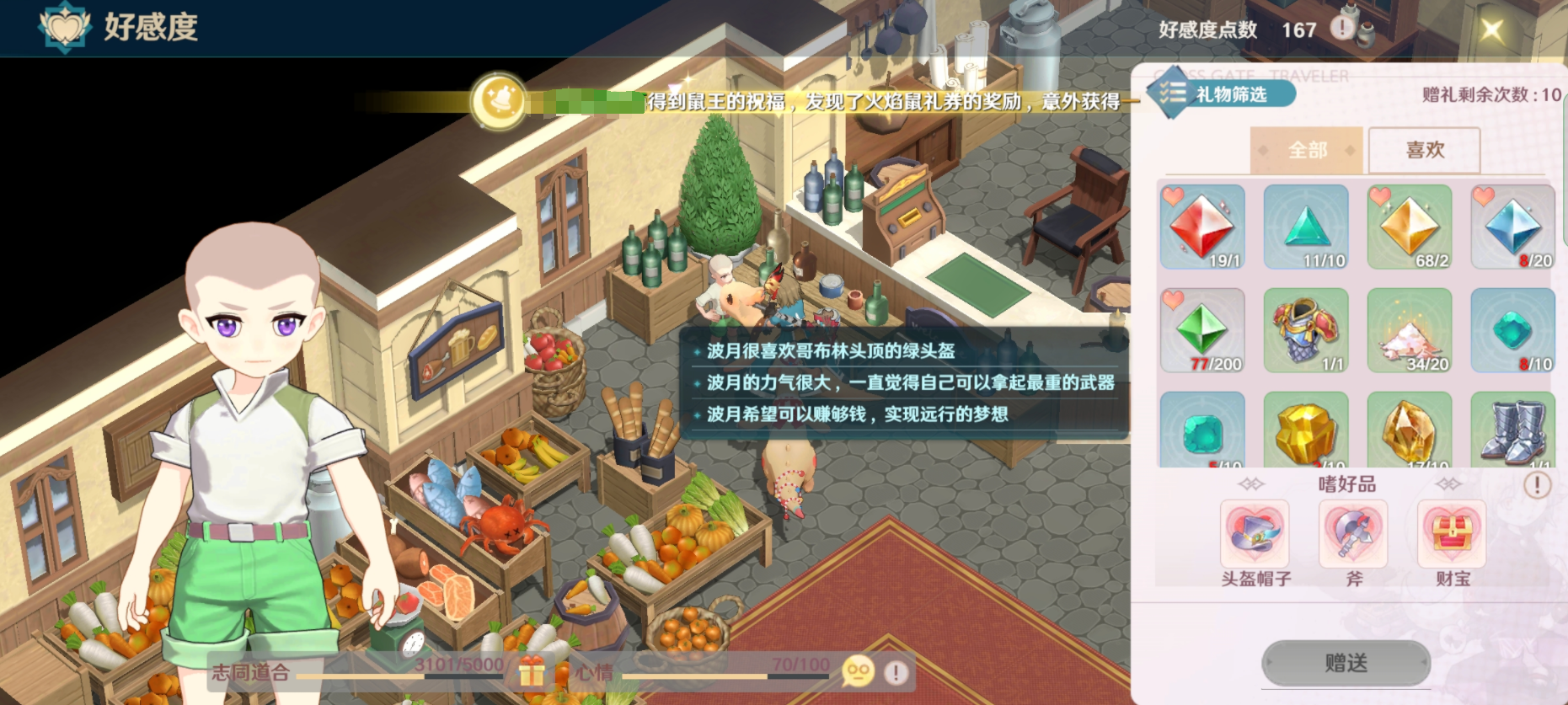 每个npc都会有三种喜欢的东西,送喜欢的东西加的好感更多,而相关的信息大家可以在赠礼界面查看,这里卡兹以波月为例,可以很容易地从描述看出,波月喜欢的礼物是头盔(尤其是哥布林的绿头盔),斧头武器以及魔石等可以换钱的道具。