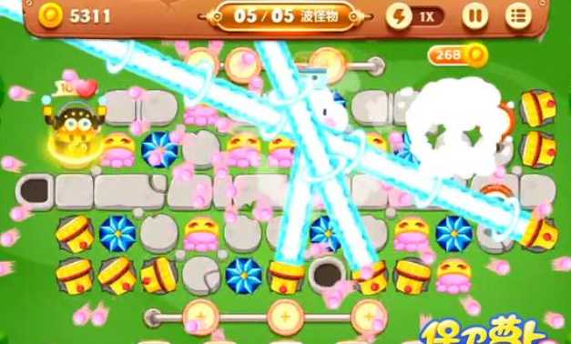 3、持续清理掉障碍,为炮塔挪位置。主要还是放章鱼和雪花,让两者配合。