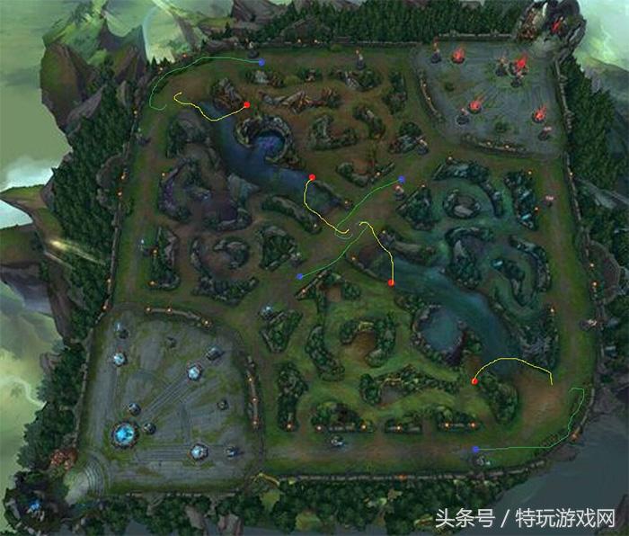 配合adc拿掉第一个红buff,此时除对方打野都是一级将升二级的样子,根据实际情况,从图中红色点隐身潜伏到对方身后,由线上玩家先手,对方交火,我们再开打保证成功几率。之后看情况通常,地方会在草里插眼,避免被发现的尴尬,可以从蓝色点隐身出发,绿色线路抓人。抓人选择思路,我方有控制的路线,对方无位移的路线,单人路线。