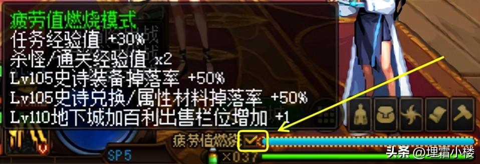 机械七战神实验室已经开放,各位小伙伴们还玩得开心嘛。时间不够用?小号肝不完?不慌,今天给各位小伙伴们介绍疲劳值燃烧系统,不肝也能畅玩阿拉德。疲劳值条左边的方框内钩√,可开