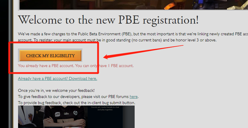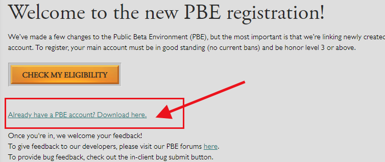 玩家成功注册PBE账号后,请返回到如下图页面,点击跳转链接,就可以下载客户端了。