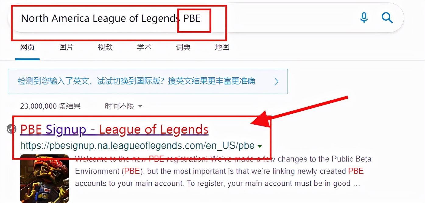 3、完成上面步骤后,记得去PBE官网确认账号有无PBE资格。输入North America League of Legends PBE并搜索,记得带上PBE,即可打开美测服的官网。