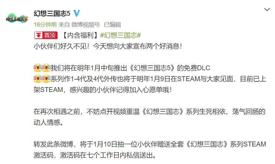 宇峻奥汀旗下国产经典RPG系列新作《幻想三国志5》已于2018年4月25日发售,官方微博今日宣布本作将于2022年1月中旬在Steam上免费推出剧情 DLC“情思无憾篇”,此外系列前四部以及4代的外传也将于1月9日在Steam上发售。