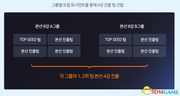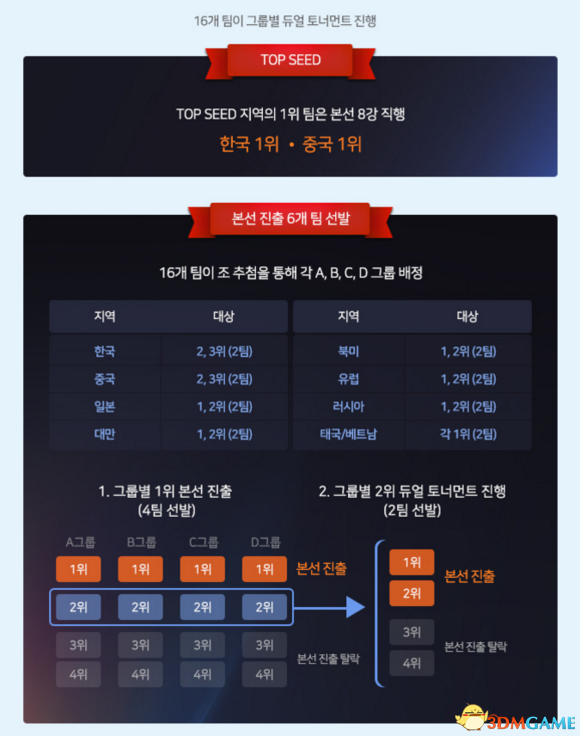 韩国区1号种子和中国区1号种子将首轮轮空,其余16队分成4组进行小组赛。