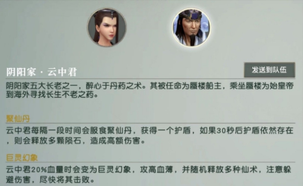云中君血量降低至20%时,会便是为巨灵幻象。幻象状态下的云中君攻击高、血量低,主要是对他面前的玩家进行攻击。所以在战斗中,主T可以吸引云中君输出,DPS从背后攻击。这样即可以避免被云中君的技能扫到,同时也能更快的将其击杀。