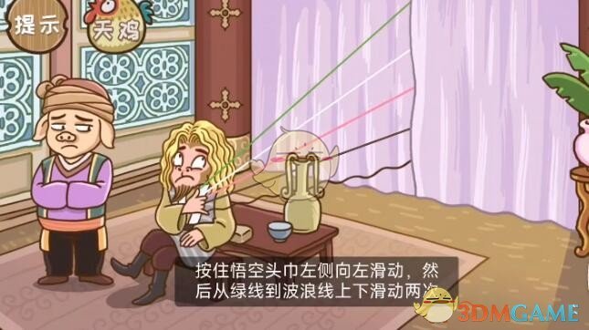 按住并点击悟空的围巾,然后向左拖动。悟空露出金毛后,反复摩挲绿线和波浪线之间的距离。组合成一根金线后,整个游戏就可以完成了。