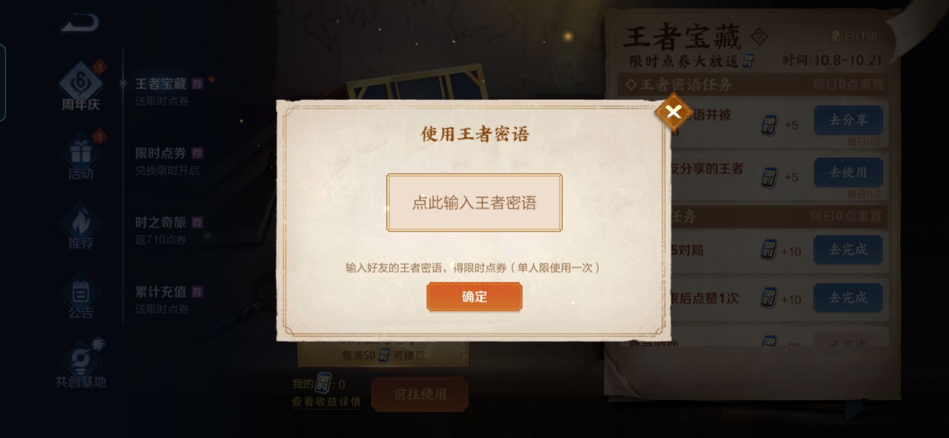 在活动中找到好友分享的王者密语,点击进入王者密语,就可以了。