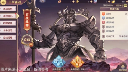 普通祭祀免费献两次,大祭司免费献一次。普通祭祀可以获得荣誉勋章,高级祭祀可以获得武道币。黄酒和青梅酒可以通过天下武功和比赛获得。青梅酒等祭祀道具每天最多可以拿到5份,黄酒每天最多可以拿到10份。战神祭祀有六个阶段,分别是战神、无双战神、传奇战神、绝世战神、不朽战神、豺狼常驻。向战神献祭。达到相应等级,可以获得相应的道具,包括二级随机灵石,三级随机灵石,木牛机关钥匙。把整个祭祀进行到一定阶段就可以晋级下一阶段的战神祭祀了。