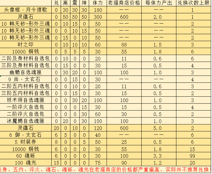 00-1010因为体验服务已经提前开了最后一关0,最后一关只出新浪币——交易所不出其他类型的新浪币,三个分支最高也只有40级,不开60级,大家可以准备开刷了。我们来看看本次活动中腐蚀之晶的价格(老猫店预估)和不同商品的体力(按最高难度计算)。
