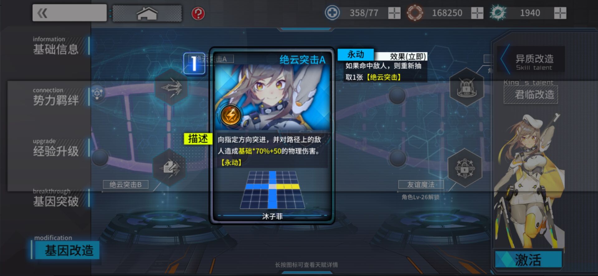 【木子非】一个技能,绝云突击,自带位移效果。基因改造升级为绝云突击A后,可以在绝云突击A命中敌人后再次释放绝云突击,在各大逃课关卡都会用到。而绝云突击B是为了增加防御效果。