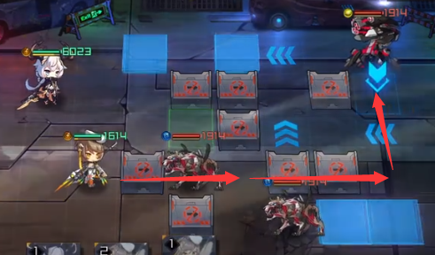 木子非在下图所示位置展开,使用【绝云突击A】移动到中间怪物后面的格子(下图第一个箭头),然后再次使用【绝云突击】到达障碍物后面的格子(第二个箭头),结束本轮。