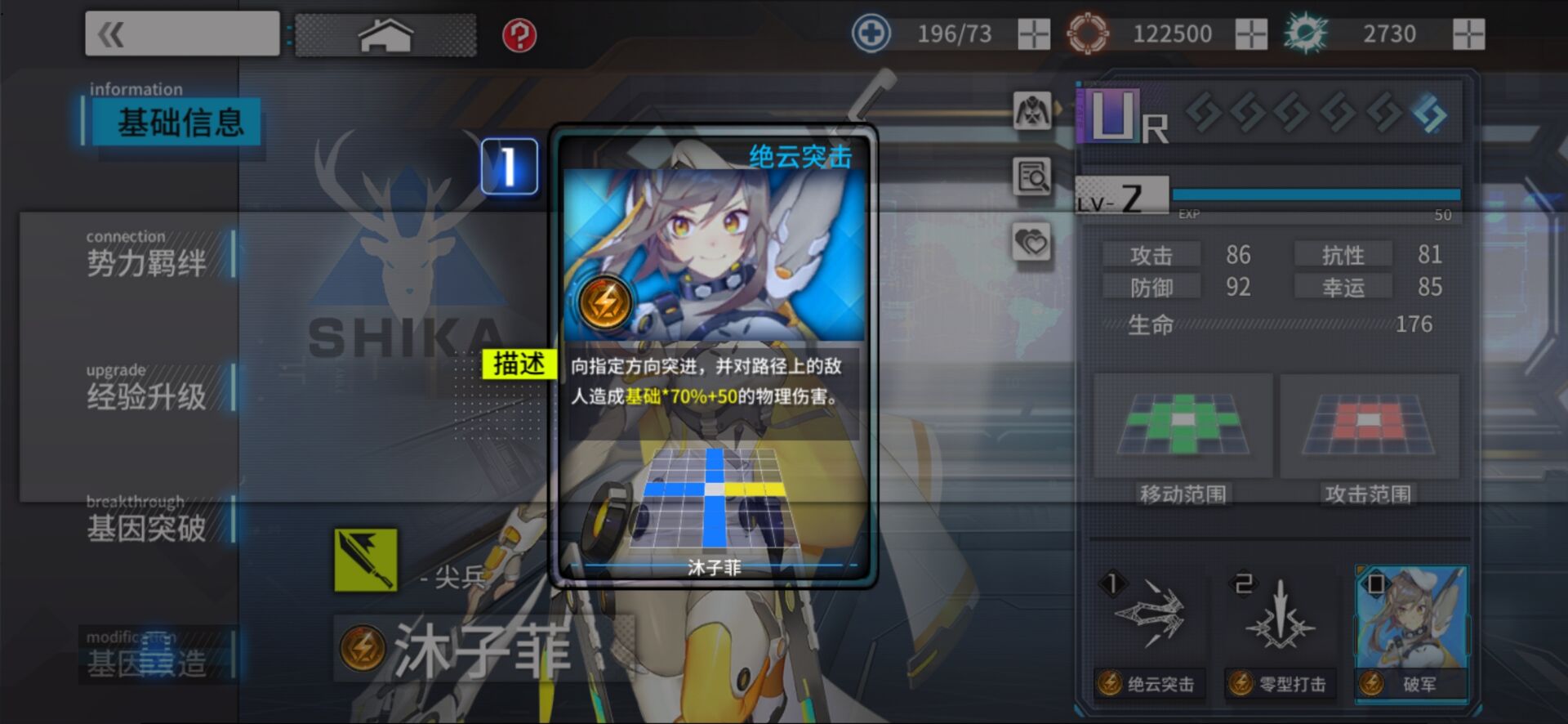 【木子非】一个技能,绝云突击,自带位移效果。基因改造升级为绝云突击A后,可以在绝云突击A命中敌人后再次释放绝云突击,在各大逃课关卡都会用到。而绝云突击B是为了增加防御效果。