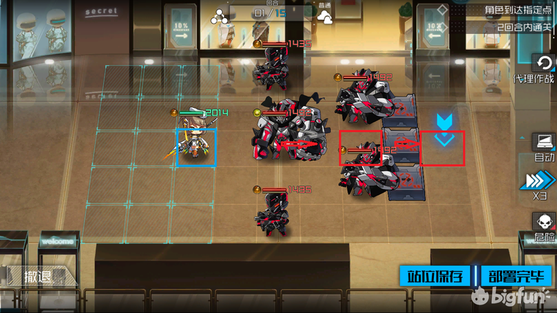 木子非部署在下图所示位置,使用【绝云突击A】(下图第一箭)移动到中间怪物后面的方块,然后再次使用【绝云突击】到达障碍物后面的方块(第二箭)通关。