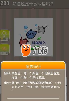 看图猜成语三条鱼排队进入答案是什么_看图猜成语之鱼贯而行,看图猜成语排队进入答案,看图猜成语三条鱼答案,看图猜成语289关答案。网上总是有玩家询问看图猜成语三条鱼排队进入答案是什么_看图猜成语之鱼贯而行,现在看图猜成语图片答案小编已经整理出来了,下面小编就为大家分享下看图猜成语所有答案吧!