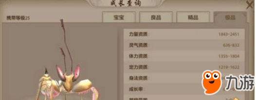 螳螂:25级可以携带,玄武岛捕捉,外功型力量珍兽。